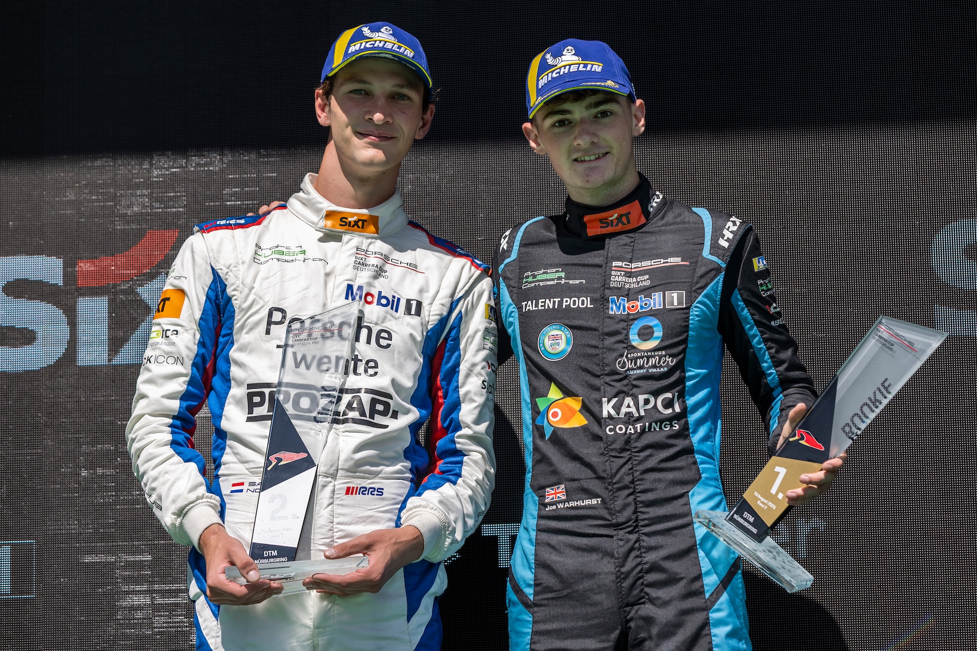 Proton Huber Competition ist auch nach dem Rennwochenende des Porsche Sixt Carrera Cup Deutschland auf dem Nürburgring weiterhin im Titelkampf. Doppelsieg in Rookie-Wertung.